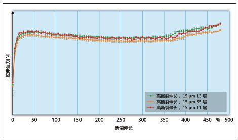 比較極限測試程序記錄的拉伸強力和斷裂伸長率, 可以得到相似的結果。在13、55層薄膜生產線的“極限曲線”中,比較了一種厚度、一種配方的易于流動薄膜(圖6a)和強力薄膜。