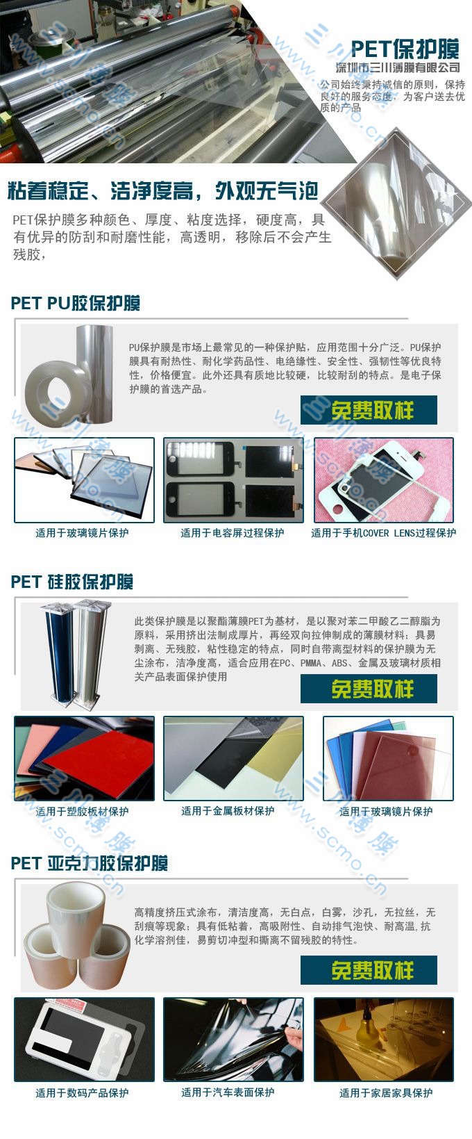 一.特性PET保護膜是乳白色或前黃色高度結(jié)晶性的聚合物,表面平滑而有光澤。耐蠕變、抗疲勞性、耐摩擦和尺寸穩(wěn)定性好,磨耗小而硬度高,具有熱塑性塑料中最大的韌性;電絕緣性能好,受溫度影響小,但耐電暈性較差。無毒、耐氣候性、抗化學藥品穩(wěn)定性好,吸水率低,耐弱酸和有機溶劑,但不耐熱水浸泡,不耐堿。